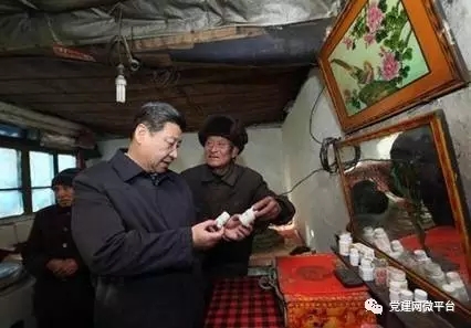2012年12月30日,习近平在河北省阜平县龙泉关镇骆驼湾村困难群众唐荣斌家,详细询问身体有病的唐荣斌(右)日常服药情况。