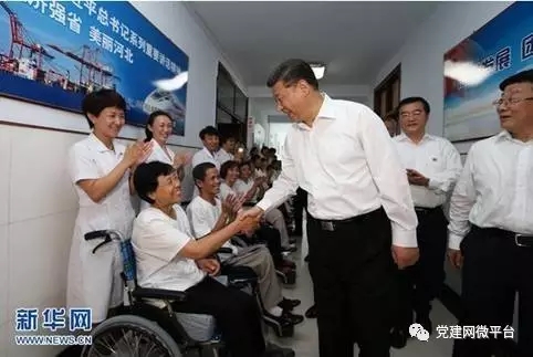 2016年7月28日,习近平到河北唐山市调研考察。在唐山市截瘫疗养院,他在康复室看望正在做康复训练的截瘫伤员,一一了解他们的伤情和康复治疗情况,问他们还有什么困难,祝他们健康长寿。活动室内,习近平勉励他们说,健全人可以活出精彩的人生,残疾人也可以活出精彩的人生。我们每个人都要珍惜生命、追求健康,努力创造无愧于时代的精彩人生。