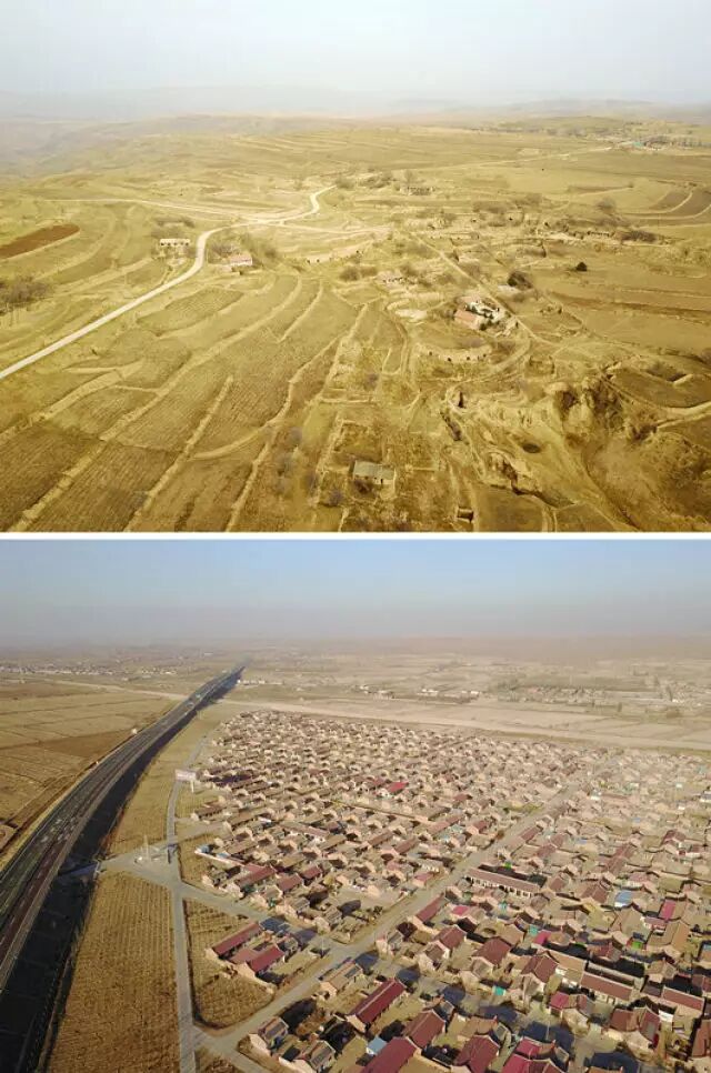 上图:从空中拍摄的宁夏海原县九彩乡,这里曾是生态移民迁出地,交通不便只能依靠盘山路出行(2016年12月13日摄);下图:从空中拍摄的宁夏中宁县宽口井村,这里是从海原县九彩乡搬迁过来的移民村,高速公路从一旁穿过(2016年12月14日摄)。 新华社记者 李然 摄