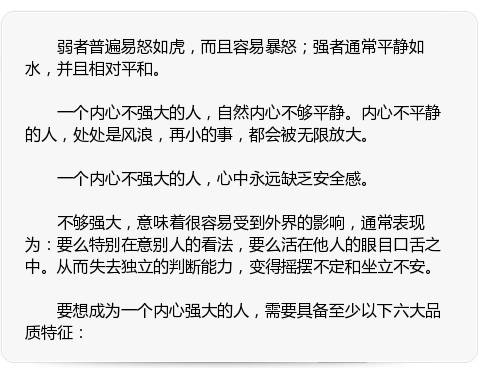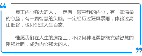 真正内心强大的人,一定有一颗平静的内心,有一颗温柔的心肠,有一颗智慧的头脑。一定经历过狂风暴雨,体验过高山低谷,也见识过人生百态。惟愿我们在人生的道路上,不论何种境遇都能充满智慧的刚强壮胆,成为内心强大的人。