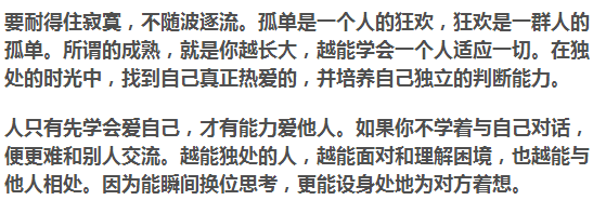 孤独和独处并不是一件事,是两码事,而且经常会被混淆。人们往往把交往看作一种能力,却忽略了独处也是一种能力,并且在一定意义上是比交往更为重要的一种能力。如果说不擅交际是一种性格的弱点,那么,不耐孤独就简直是一种灵魂的缺陷了。