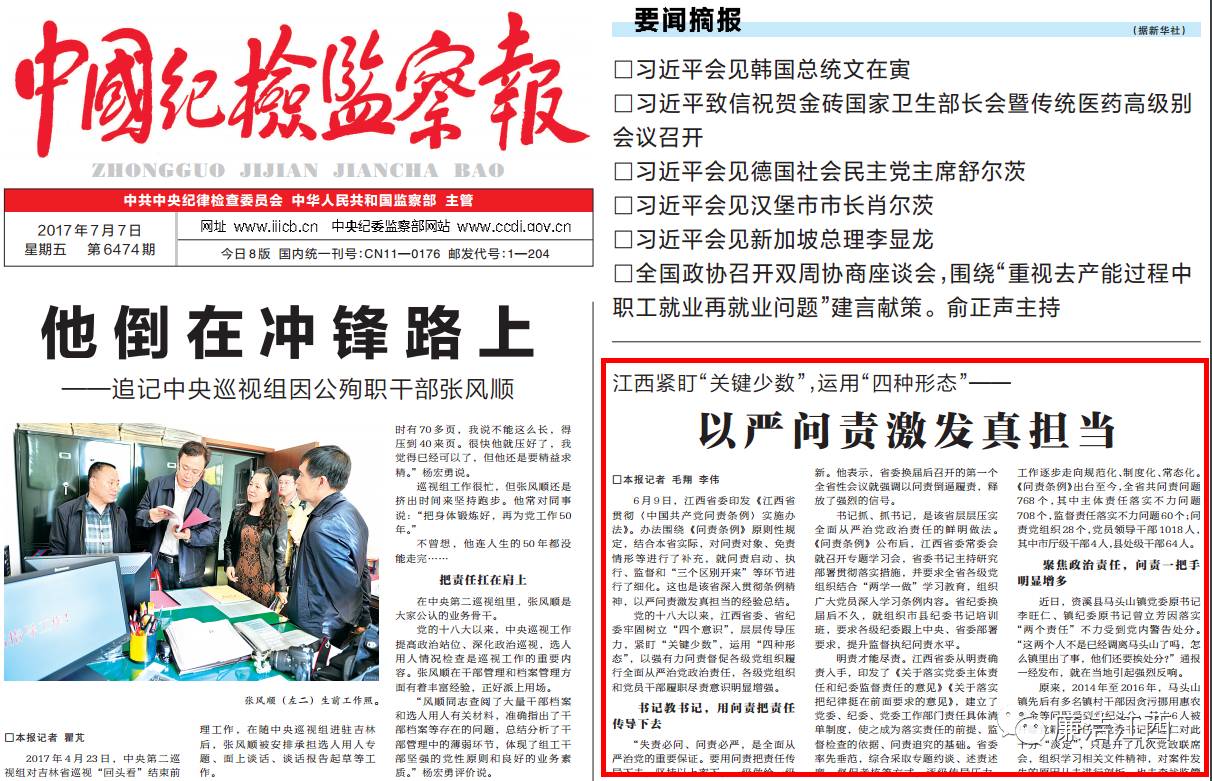 6月9日,江西省委印发《江西省贯彻〈中国共产党问责条例〉实施办法》。办法围绕《问责条例》原则性规定,结合本省实际,对问责对象、免责情形等进行了补充,就问责启动、执行、监督和“三个区别开来”等环节进行了细化。这也是该省深入贯彻条例精神,以严问责激发真担当的经验总结。